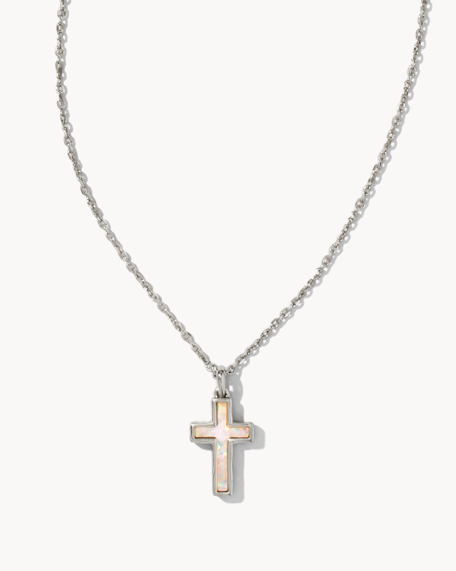 Cross Silver Pendant Necklace in White Kyocera Opal