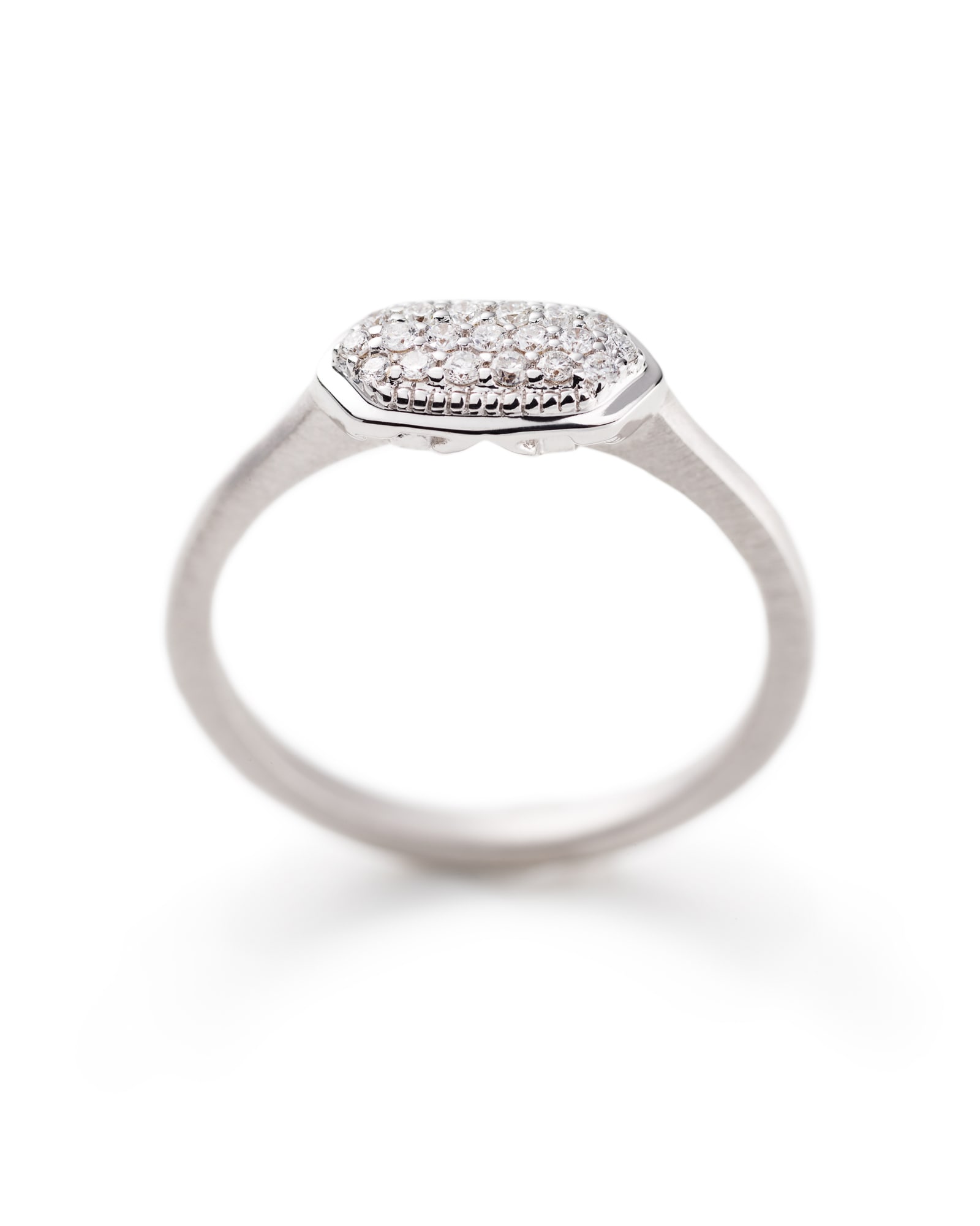A token of timeless beauty, the Isa Ring celebrates our trademark oval shape in a delicate frame of 14k White Gold and custom sized Pave Diamonds. Our diamonds are conflict-free in compliance with the Kimberly Process.