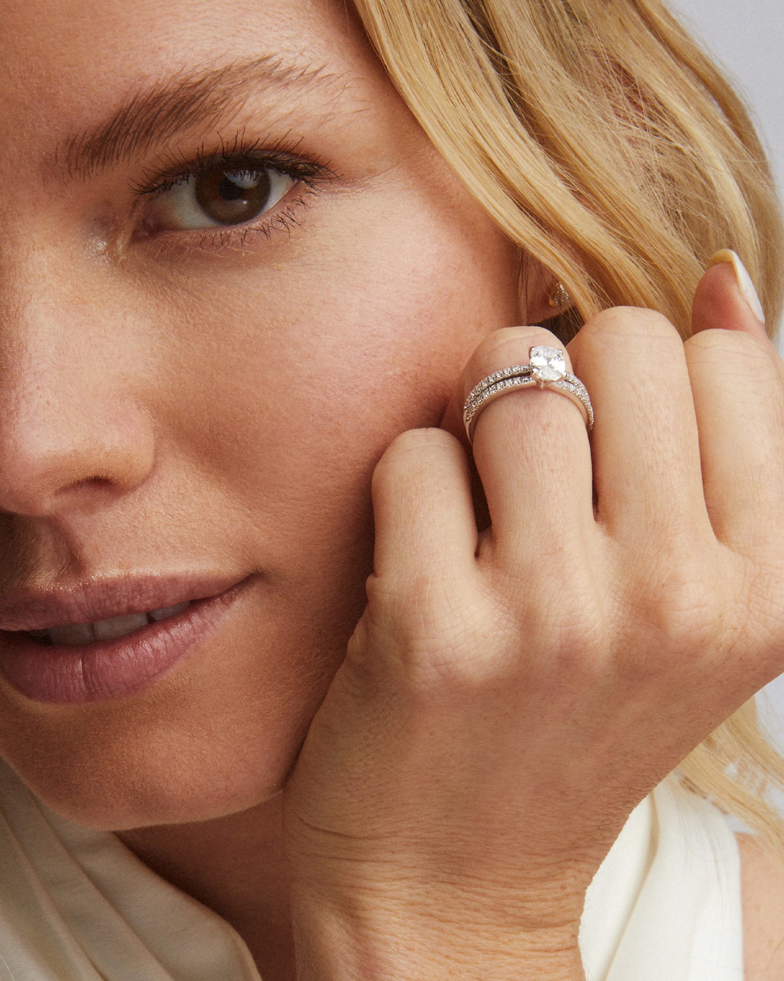This ring can be customized in either 14k yellow gold, 14k white gold, or 14k rose gold with center cut lab grown diamond weights starting at 0.5 carats and extending up to 2 carats. Pavé carat weights extend up to one carat with ring sizes available in 4-10, with ¼ sizes. And you’ll even find a pop of Kendra Scott’s signature yellow in the form of a yellow sapphire at the base of the center stone’s setting.