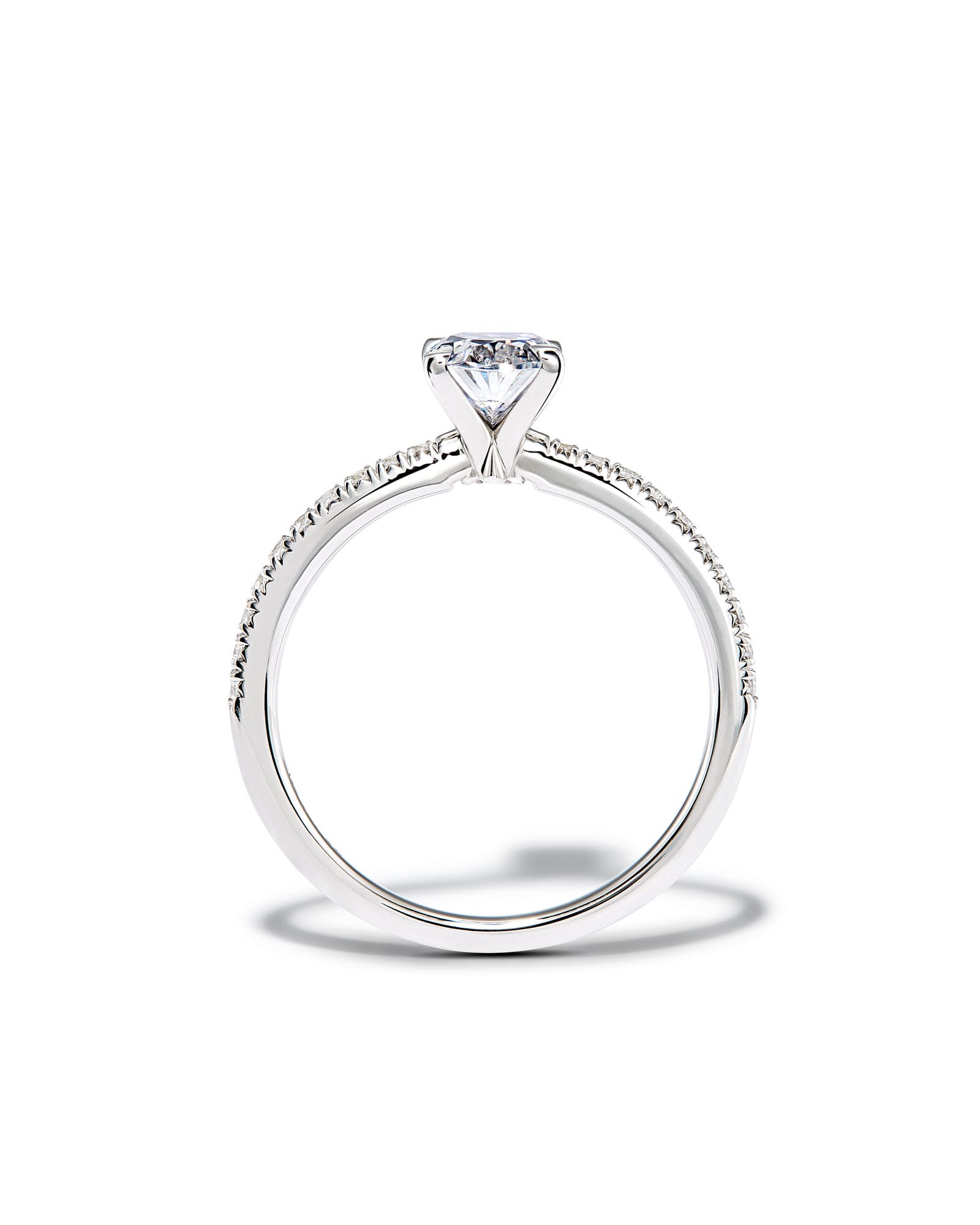 Featuring an oval stone flanked by a bright band, our Oval Solitaire Engagement Ring with Pavé Diamonds in 14k White Gold elevates this traditional look into a spectacular modern arrangement.