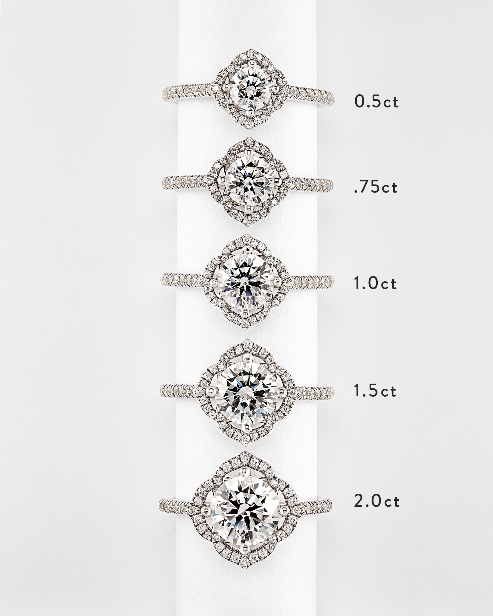 This ring can be customized in either 14k yellow gold, 14k white gold, or 14k rose gold with center cut lab grown diamond weights starting at 0.5 carats and extending up to 2 carats. Pavé carat weights extend up to one carat and ring sizes are available in 4-10, with ¼ sizes.
