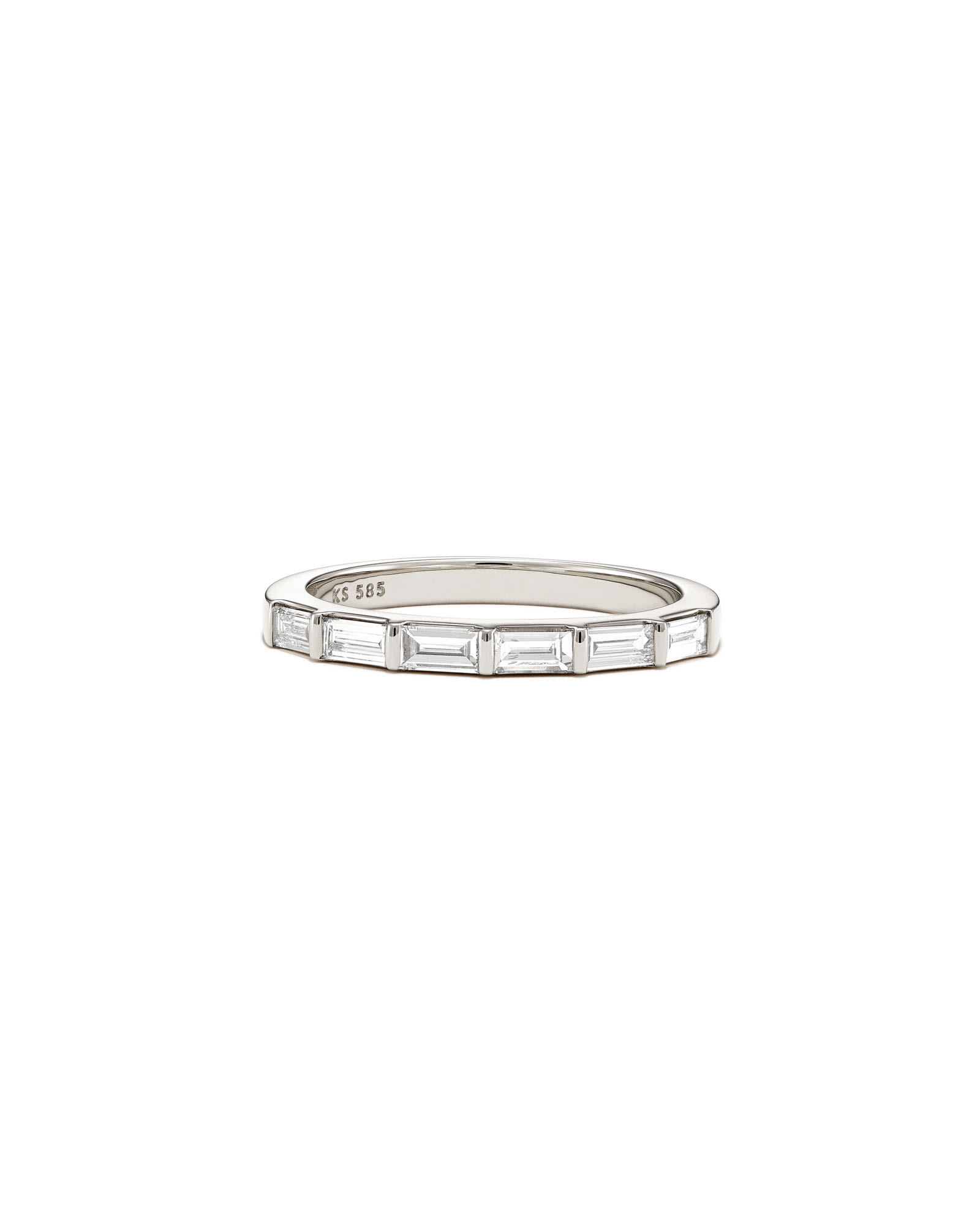Lined with baguette diamonds, the Isabella 14k White Gold Half Eternity Band Ring in White Diamond is set with six hand-placed stones, promising a lifetime of high shine. Polished 14k gold and a timeless silhouette make this classic ring one to be passed down for generations to come.