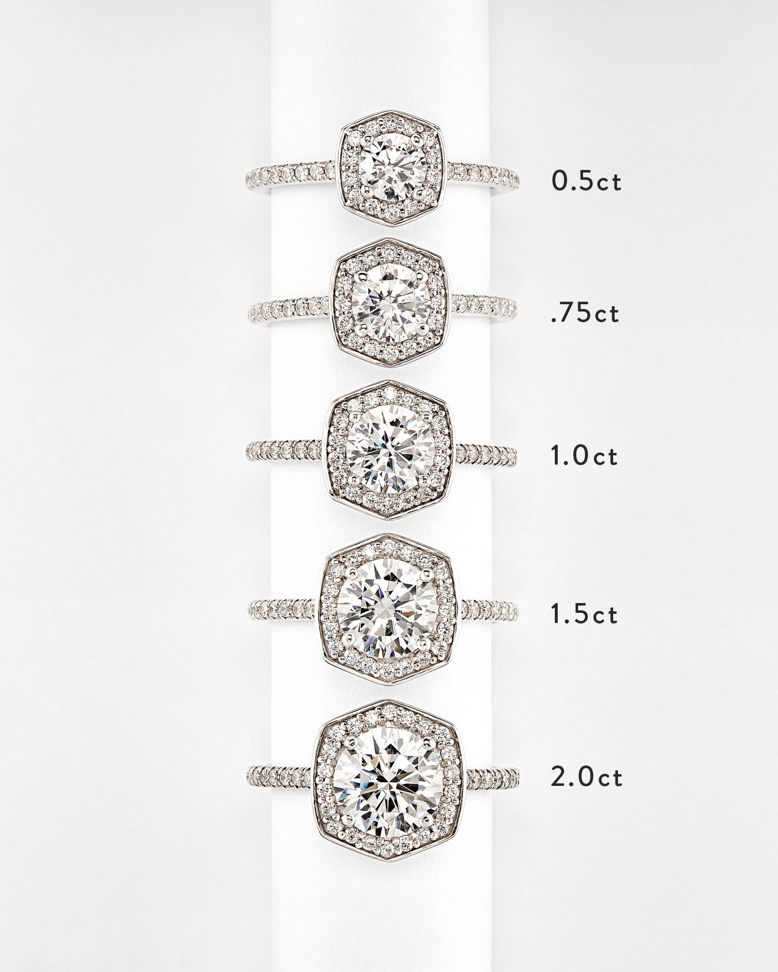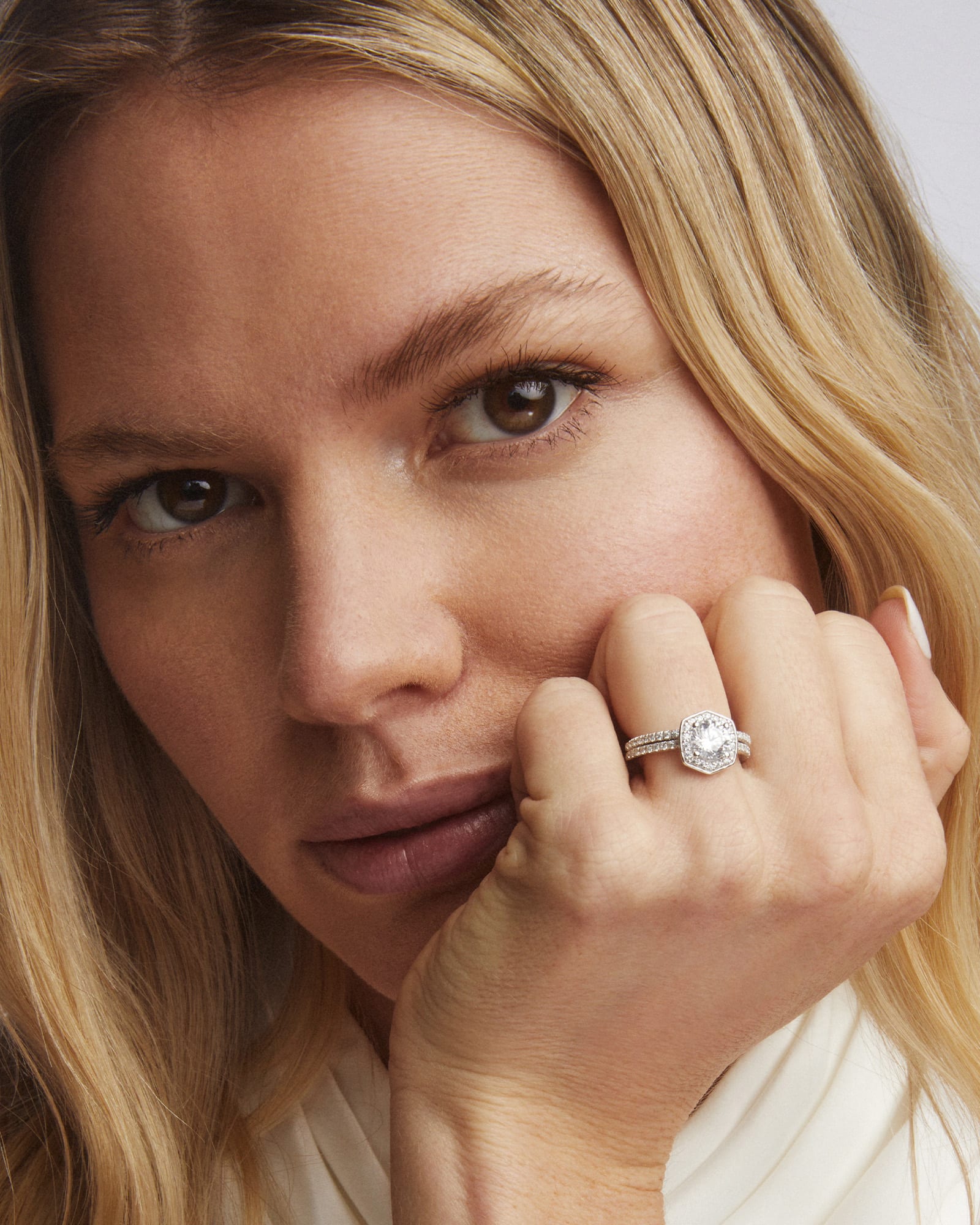 This ring can be customized in either 14k yellow gold, 14k white gold, or 14k rose gold with center cut lab grown diamond weights starting at 0.5 carats and extending up to 2 carats. PavĆ© carat weights extend up to one carat with ring sizes available in 4-10, with ¼ sizes. And youāll even find a pop of Kendra Scottās signature yellow in the form of a yellow sapphire at the base of the center stoneās setting.