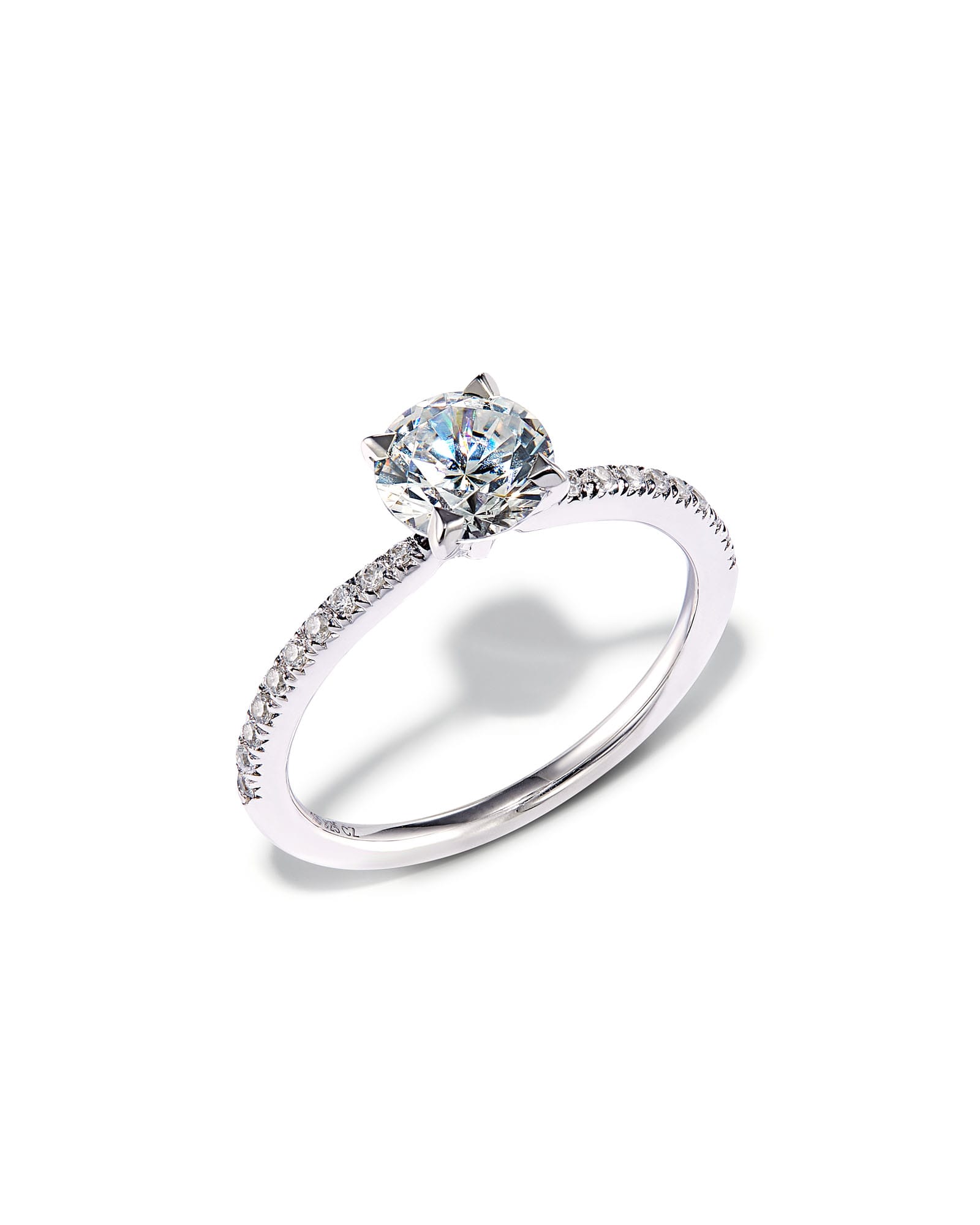 Combining the classic round solitaire silhouette with a pavé diamond band, our Round Solitaire Engagement Ring with Pavé Diamonds in 14k White Gold brings a whole lot of shine to your once-in-a-lifetime romance.