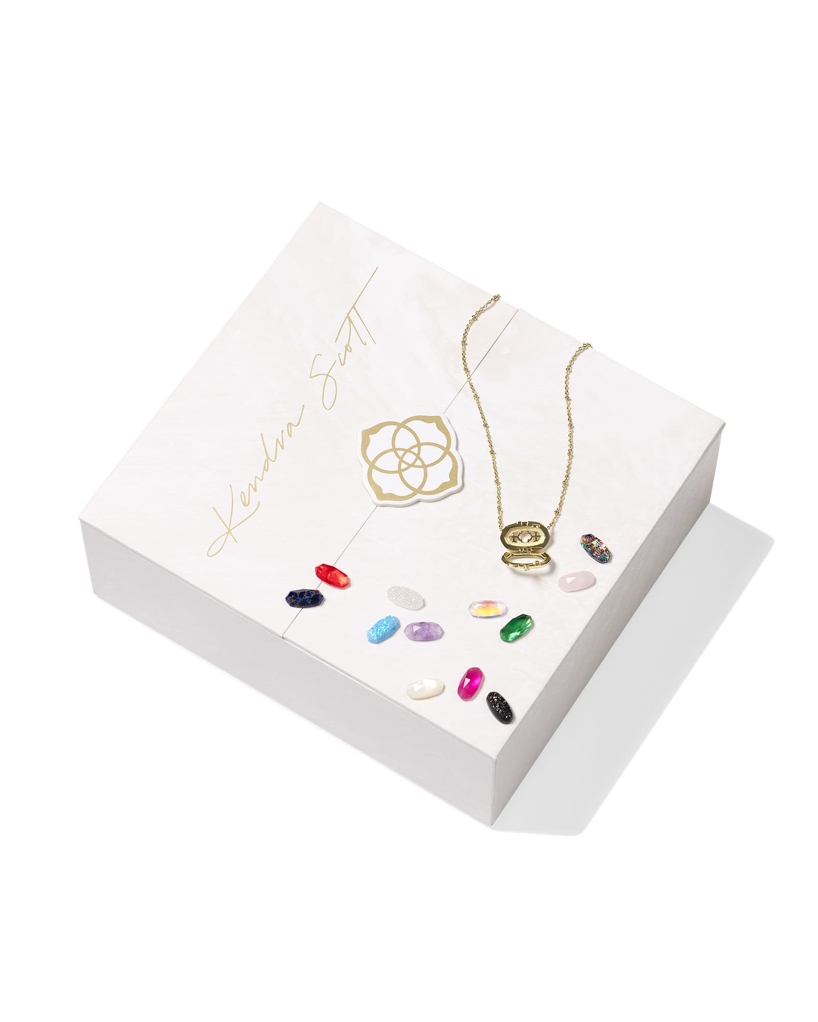 Set includes Elisa Locket Pendant Necklace and 12 interchangeable stones: Ivory Mother-of-Pearl, Iridescent Drusy, Dichroic Glass, Black Drusy, Black Iridescent Glitter Glass, Red Illusion, Azalea Illusion, Rose Quartz, Kelly Green Illusion, Ocean Kyocera Opal, Bronze Veined Lapis, and Amethyst.
