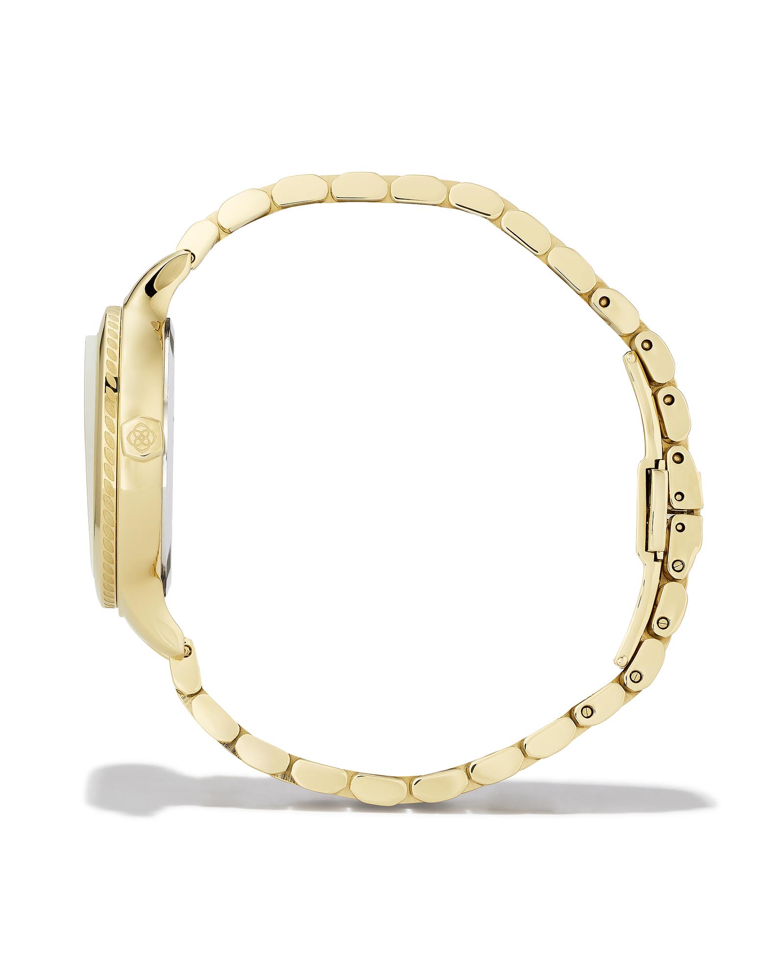 Designed in the most polished of metals and with a sapphire glass case, the Alex Gold Tone Stainless Steel 35mm Narrow Watch Band in Ivory Mother-of-Pearl is one you never have to take off. A minimal take on the fan-favorite Alex Watch Band, this elevated timepiece features a shimmering mother-of-pearl face complete with our iconic medallion logo.