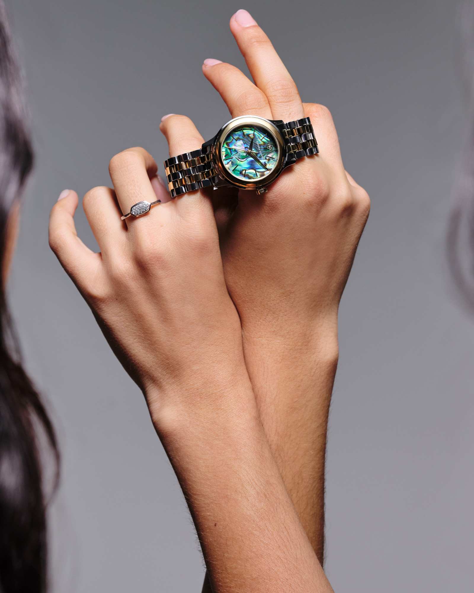 Crafted to last, the Alex Two Tone Stainless Steel 35mm Watch in Abalone is designed with the most polished of metals and a sapphire glass case to bring glamour and sophistication to your everyday. True to our love of sparkle and elevated details, you can find a glimmer of diamond embedded within our iconic medallion logo. We have taken steps to ensure that, when applicable, our diamonds are conflict free by requiring our suppliers to comply with the Kimberley Process.