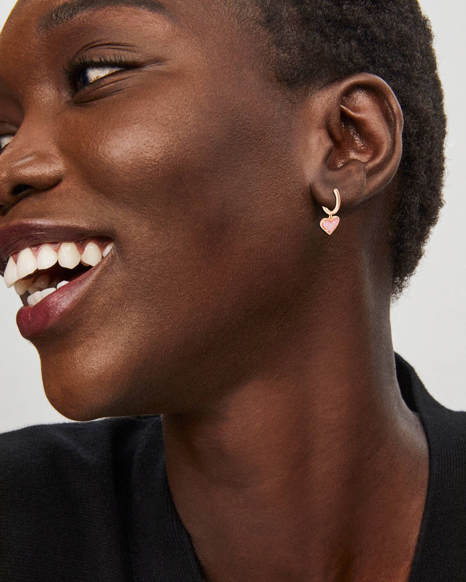Hearts and huggies together – is there anything better? The Ari Heart Rose Gold Huggie Earrings in Light Pink Drusy adds that little something extra to your look with its playful asymmetrical design.