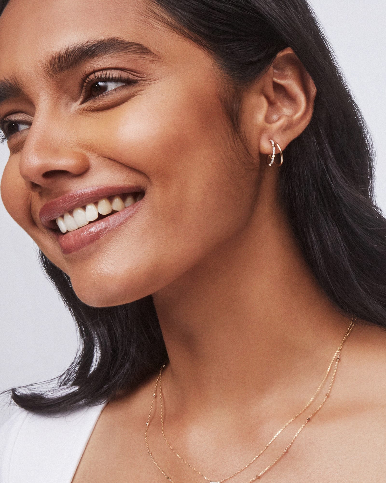 Diamond dusted with the most sparkling of elevated accents, the Astrid 14k Yellow Gold Split Hoop Earrings in White Diamond are a collection classic, with a young, trending aesthetic. Beloved for its head-turning split silhouette designed to sparkle from every angle, you’ll cherish this timeless pair as a part of your forever collection.