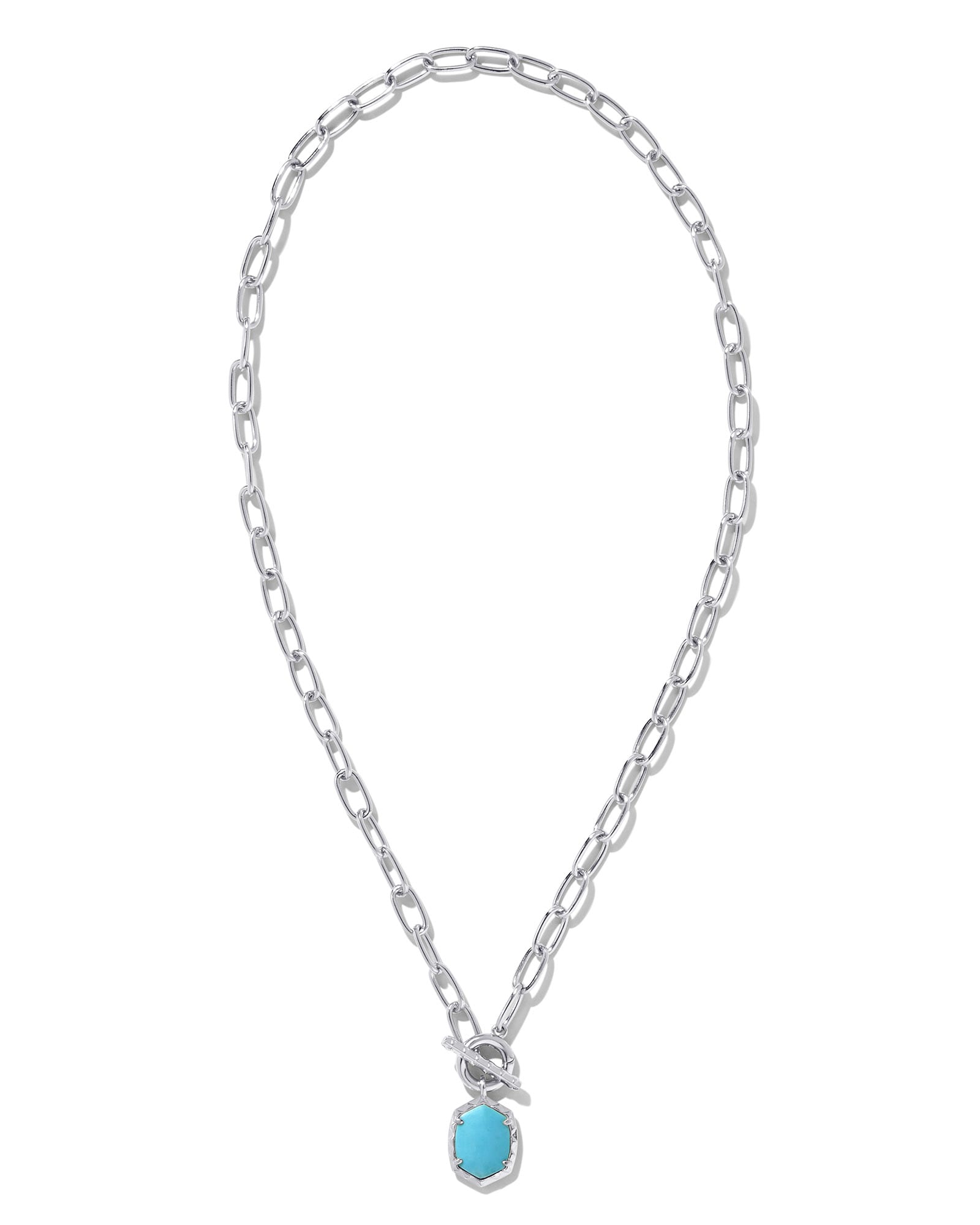 Meet the latest MVP (or should we say most valuable layer?) in your necklace stack. The Daphne Silver Link and Chain Necklace in Variegated Turquoise Magnesite features the newest iteration of our signature oval shape as a charm on a trendy paperclip chain with a toggle closure. It’s convertible, too: wear the charm for a bold splash of color or remove it for a chic metal moment.