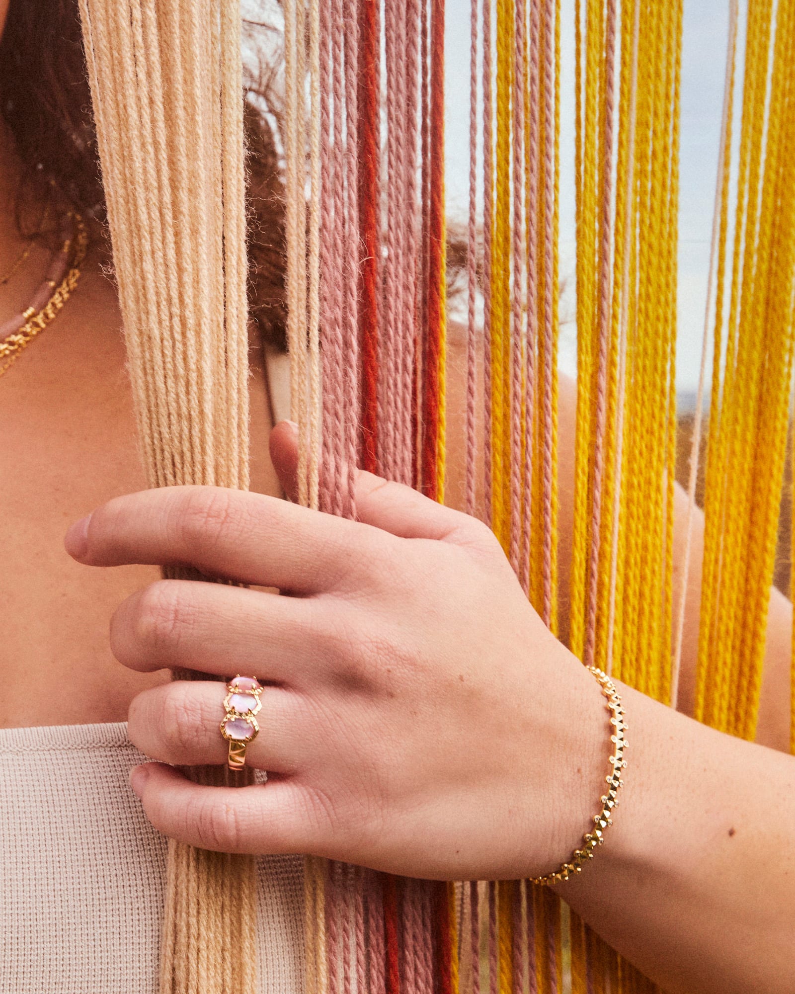 Meet your new stacking obsession, the Daphne Gold Band Ring in Light Pink Iridescent Abalone. Featuring three stunning stones encased in a sleek, textured band, this ring can definitely shine on its own, but it also plays well with your other styles.