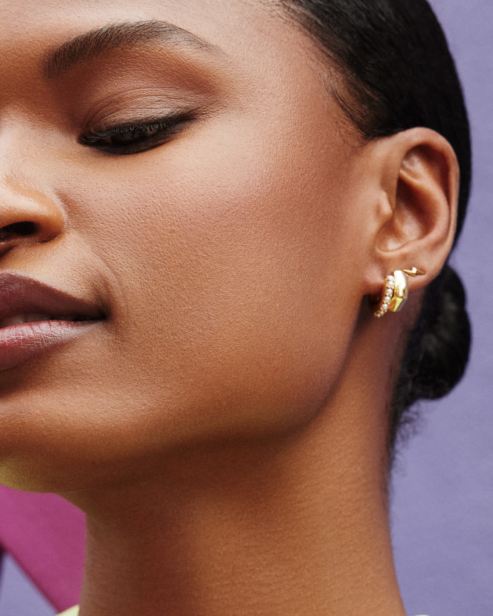 A fan-favorite shape meets the pearl trend in the Davie 18k Gold Vermeil Huggie Earrings in Freshwater Cultured Pearl. Our classic Davie silhouette is studded with freshwater cultured pearls, making these sweet huggie earrings the perfect mix of trendy and timeless.