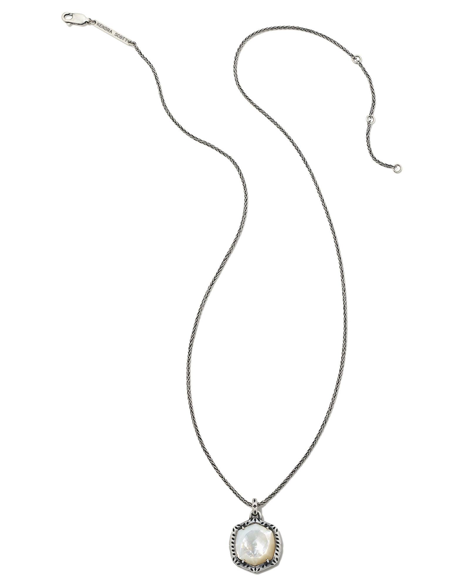 A Kendra Scott icon takes a trip to the rodeo in the Davis Oxidized Sterling Silver Etch Frame Short Pendant Necklace in Ivory Mother-of-Pearl. Etched detailing inspired by tooled leather saddles frames our Davis shape, adding a charming touch to this beloved silhouette.