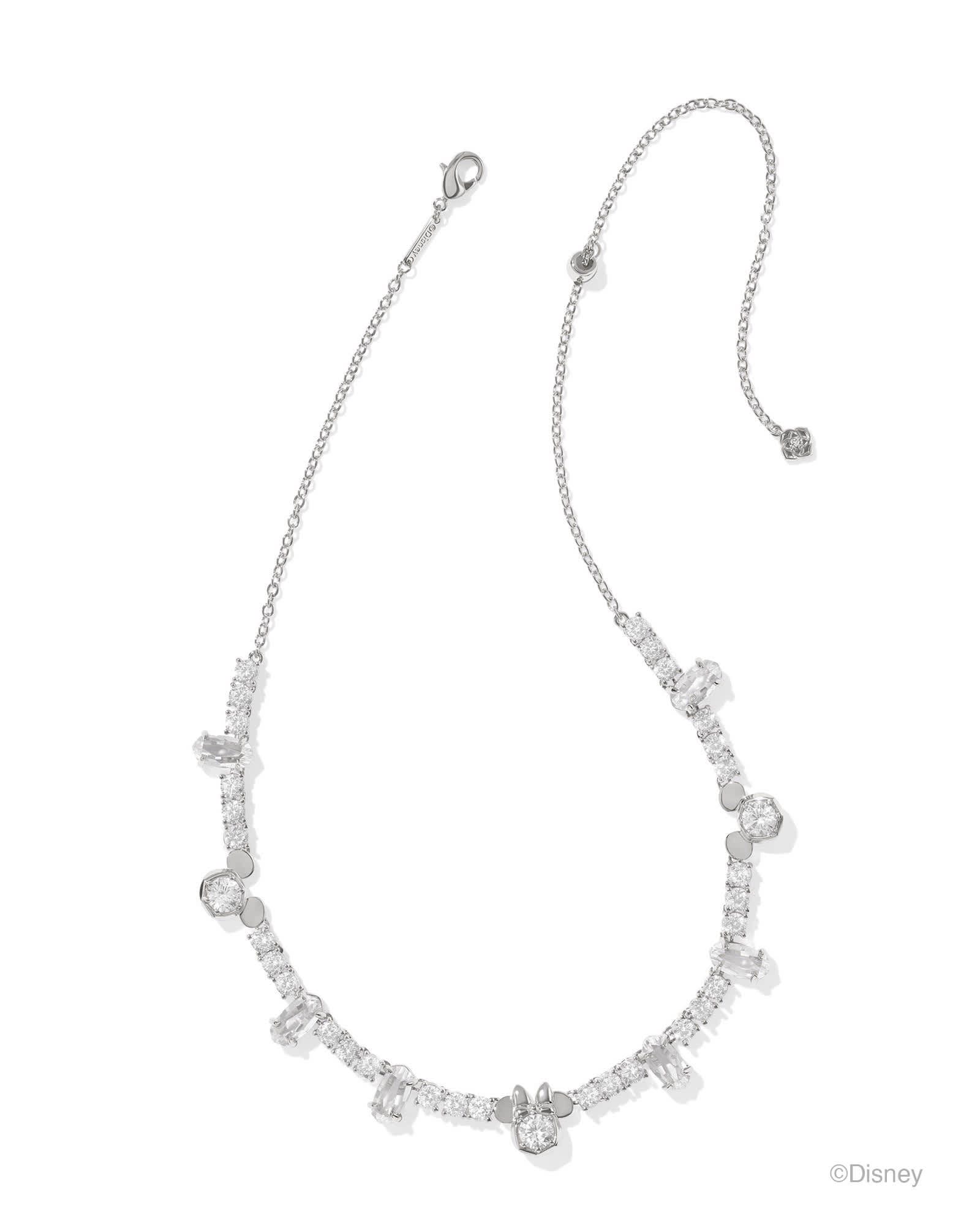 Step into a wonderful world full of magic and style wearing the Disney | Kendra Scott Silver Mickey Mouse and Minnie Mouse Tennis Necklace in White CZ. A playful mixture of crystals and mini motifs of Disneyās darling sweethearts, this adjustable tennis necklace is as sweet as it is chic.