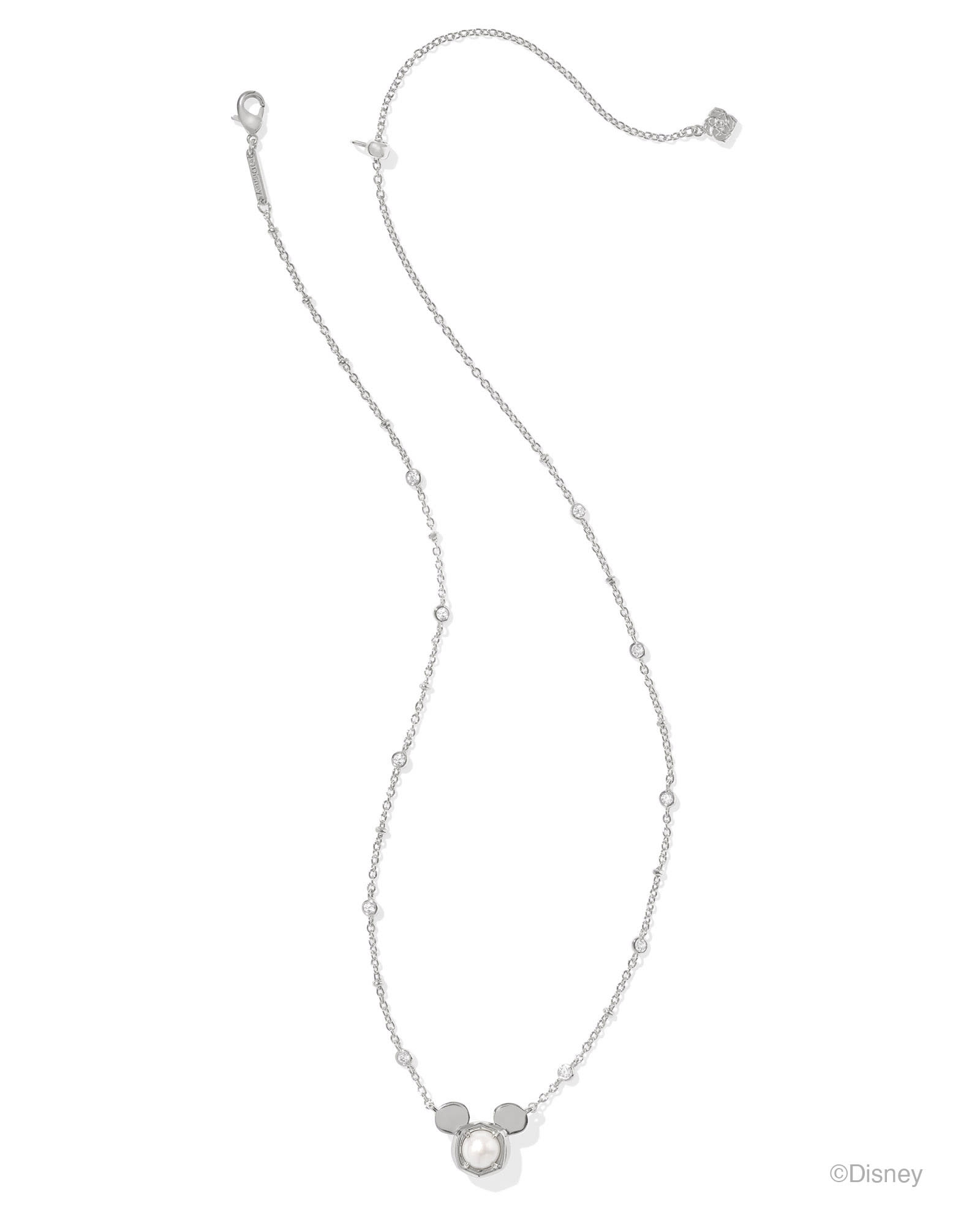 Experience the feeling of everyday magic with the Disney | Kendra Scott Silver Mickey Mouse Short Pendant Necklace in Freshwater Cultured Pearl. A signature KS pendant topped with Disney Mickey Mouse ears gets an extra dose of dazzle with a crystal-studded satellite chain. Timeless, iconic, and full of joy, this precious pendant will sprinkle a bit of extraordinary into your everyday looks.