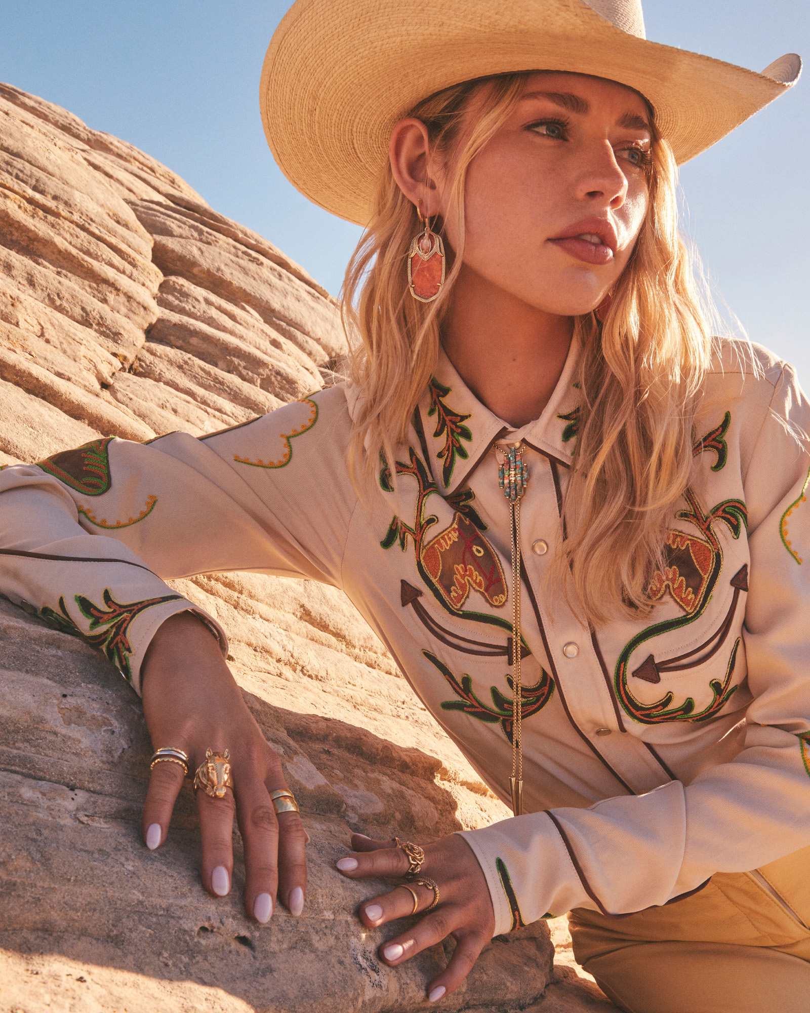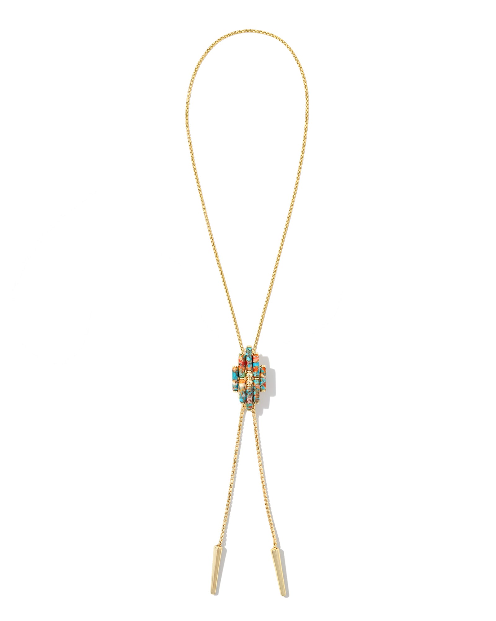 The Ember Gold Bolo Necklace in Bronze Veined Turquoise Magnesite Red Oyster was designed to stand out. A unique way to add dimension to your layered look, this necklace combines Southwest-inspired design with eye-catching beaded materials. Styled solo or layered with your everyday essentials, this piece will put you front and center. This necklace is a part of Yellow Rose by Kendra Scottāa brand that celebrates ranch life with Kendra Scott staples alongside select curated jewelry pieces and accessories.