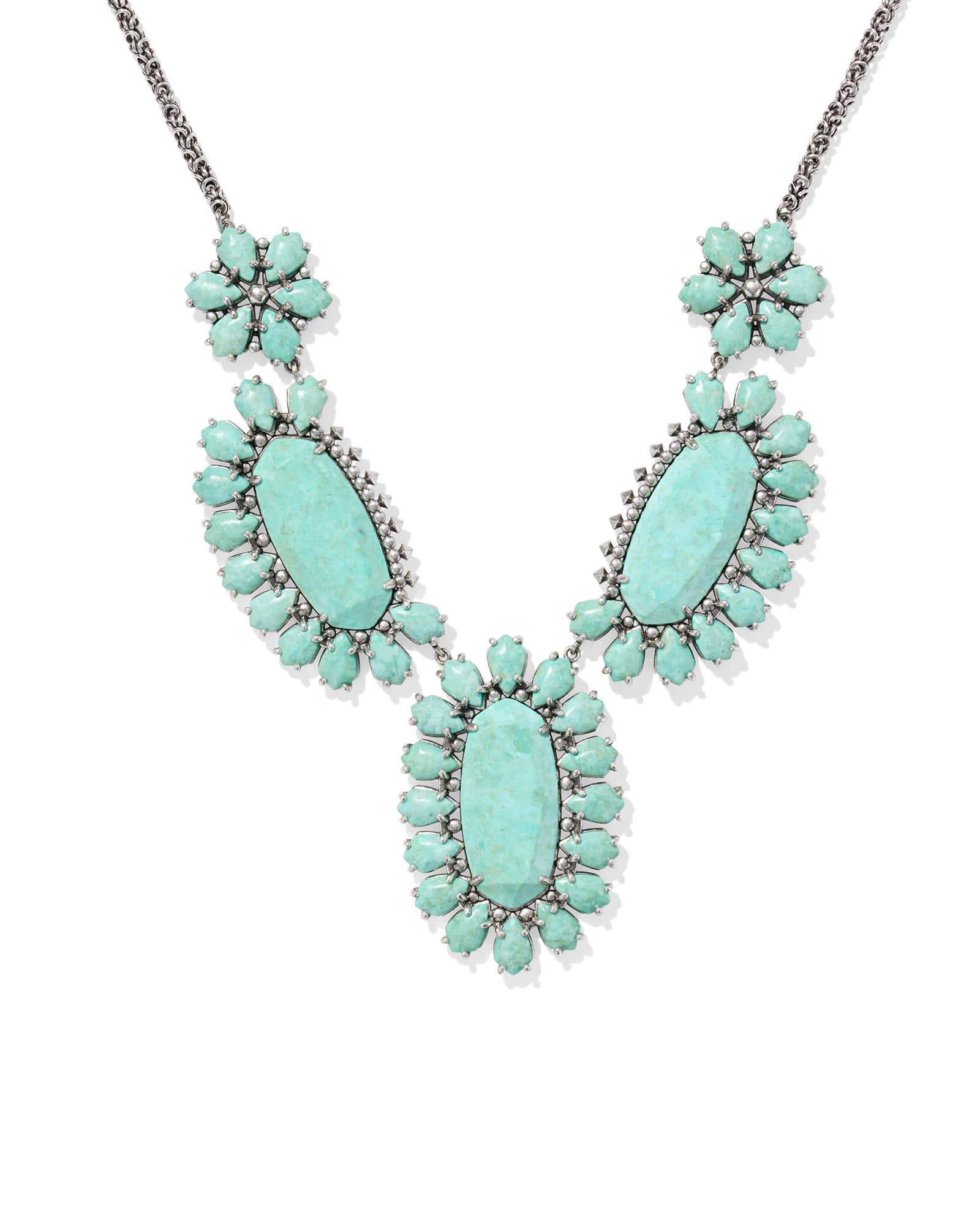 Make it a main character moment with the Flynn Vintage Silver Statement Necklace in Sea Green Chrysocolla. Featuring an array of gorgeous stones framed by beautiful metal detailing, this necklace is a chic finishing touch for any outfit. And it has a sliding adjuster, which means you can make it fit perfectly with a sundress, tank, or denim shirt.