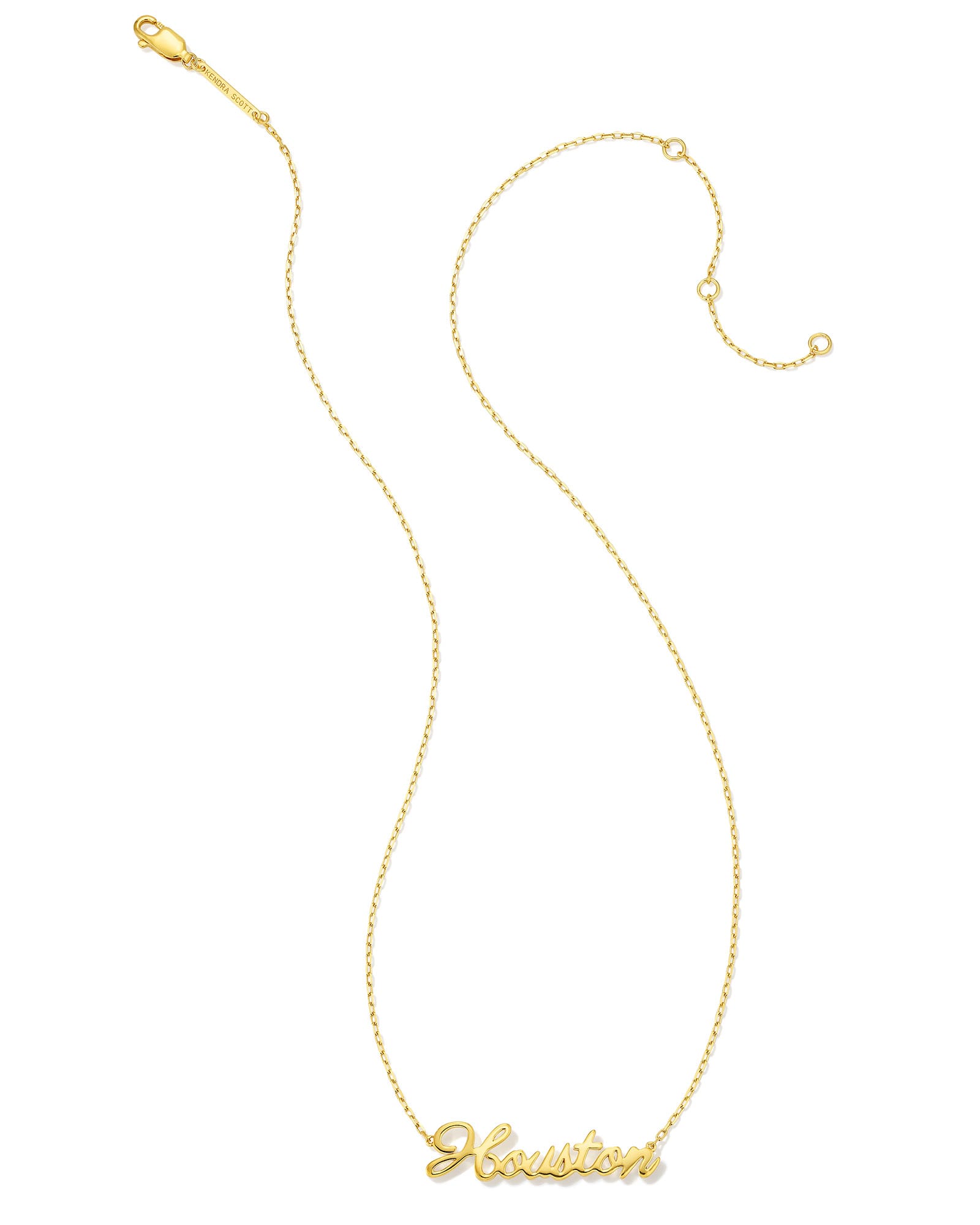 Hey, Houston! Take a little piece of home with you wherever you are with the Houston Pendant Necklace in 18k Gold Vermeil. Crafted in a cursive script with metals more resistant to tarnishing, this pendant will add personality to your look for years to come.