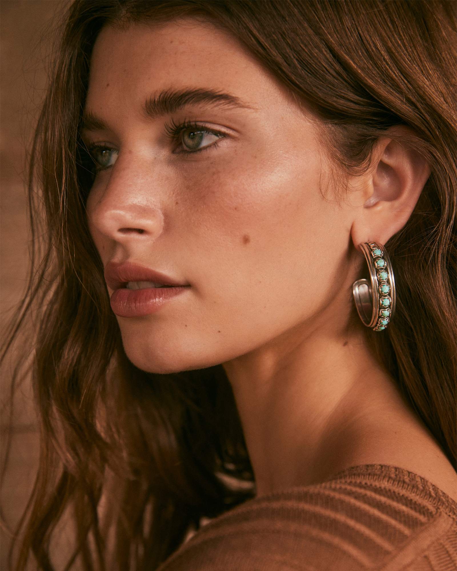 Need some texture in your earring collection? Round up the Ida Vintage Silver Hoop Earrings in Sea Green Chrysocolla. With their sleek hoop silhouette, vintage metal detailing, and beautiful stone beading, this style has it all.