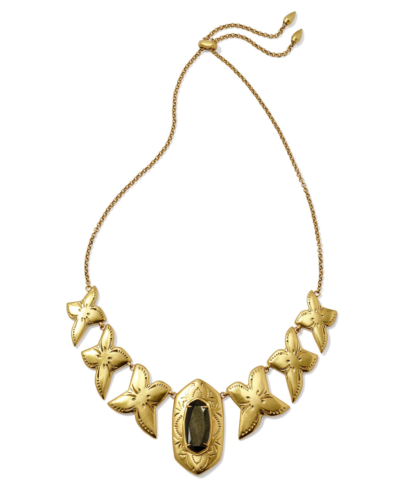 Embark on new styling adventures with the Keziah Vintage Gold Statement Necklace in Golden Obsidian. Crafted with oversized, kilim-inspired metal motifs and finished off with a head-turning stone center in our signature shape, this adjustable necklace is a statement piece like no other.