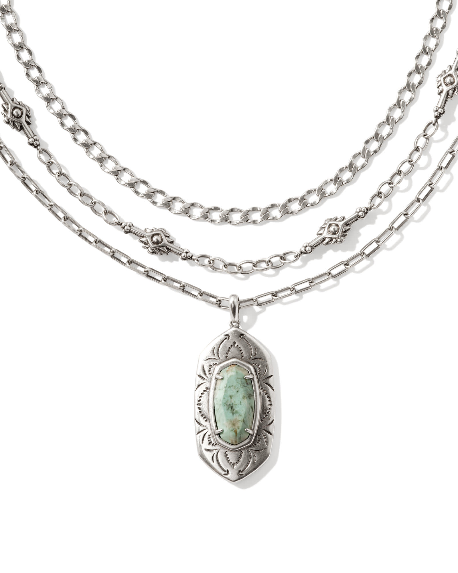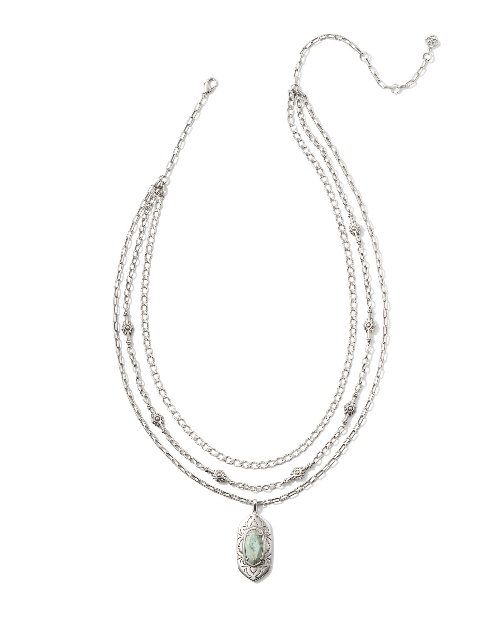 You’ll have all your bases covered (and fits accessorized) with the Keziah Vintage Silver Strand Necklace in Sea Green Chrysocolla. A stone pendant in our signature shape steals the spotlight with an intricately etched frame, while two vintage-inspired metal chains add depth and texture to this multi strand stunner. This three-in-one style is also adjustable, so you can change the length of your pre-layered look to your liking. This necklace is a part of Yellow Rose by Kendra Scott—a brand that celebrates ranch life with Kendra Scott staples alongside select curated jewelry pieces and accessories.