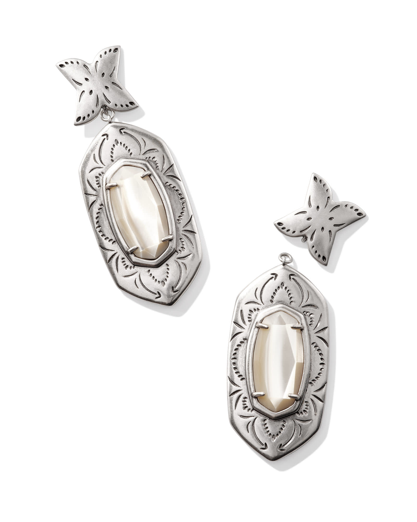 With their etched detailing, vintage-inspired metal, and oversized frame, the Keziah Vintage Silver Statement Earrings in Natural Mother-of-Pearl are bound to make you the topic of conversation. Whether youāre accessorizing a more gussied-up look or just wanting to add some flair to your day-to-day fits, these earrings make a one-of-a-kind statement. These earrings are a part of Yellow Rose by Kendra Scottāa brand that celebrates ranch life with Kendra Scott staples alongside select curated jewelry pieces and accessories.
