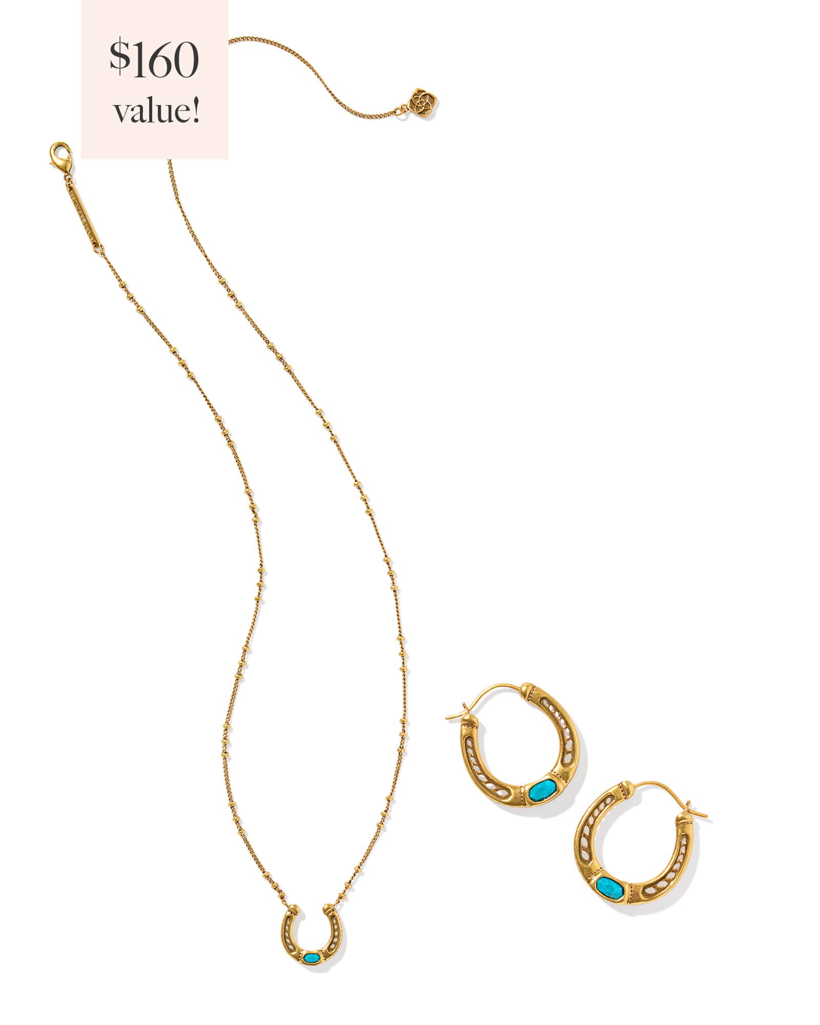 A must for every cowgirl collection, meet the Noble Vintage Gold Horseshoe Gift Set of 2 in Variegated Dark Teal Magnesite. Both styles feature the classic horseshoe shape with textured detailing and a dainty stone center for a pop of color. Set includes the Noble Horseshoe Pendant Necklace and Noble Horseshoe Hoop Earrings.
