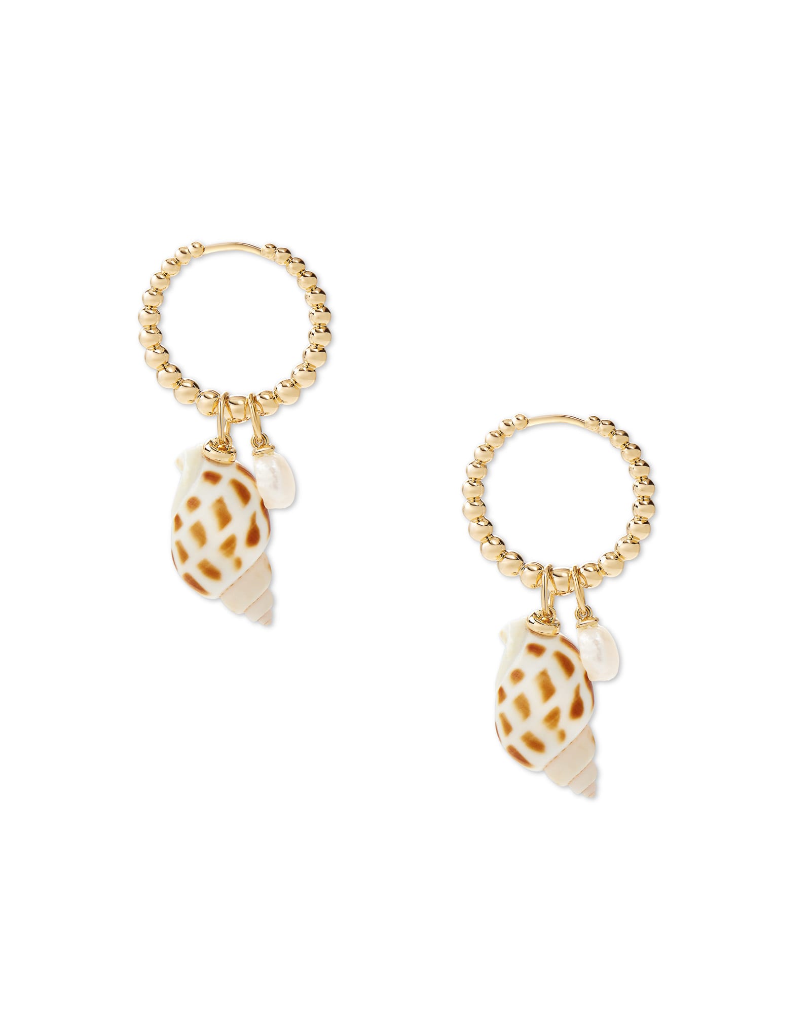 Kick off your vacay in style with the beachiest huggies around! Complemented by a freshwater cultured pearl and one-of-a-kind spotted shells, the Oleana Gold Huggie Earrings are the cutest accessory from here to Atlantis. Mix and match the removable charms for a more playful vibe, or style alone for a minimalist, metallic look.