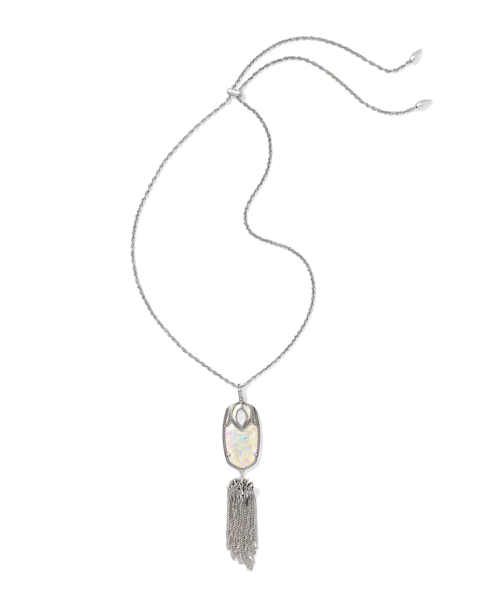 You know her, you love her: it’s the Rayne Vintage Silver Large Long Pendant, back from the KS archive and refreshed for Yellow Rose by Kendra Scott. Rayne features our signature oval shape and a bold tassel detail, and this fresh take has feathered metal etching and a beautiful stone overlay, too. And with its sliding adjuster, you can get the perfect fit for any outfit and neckline. For an iconic matching look, try pairing Rayne with the Darby Drop Earrings.