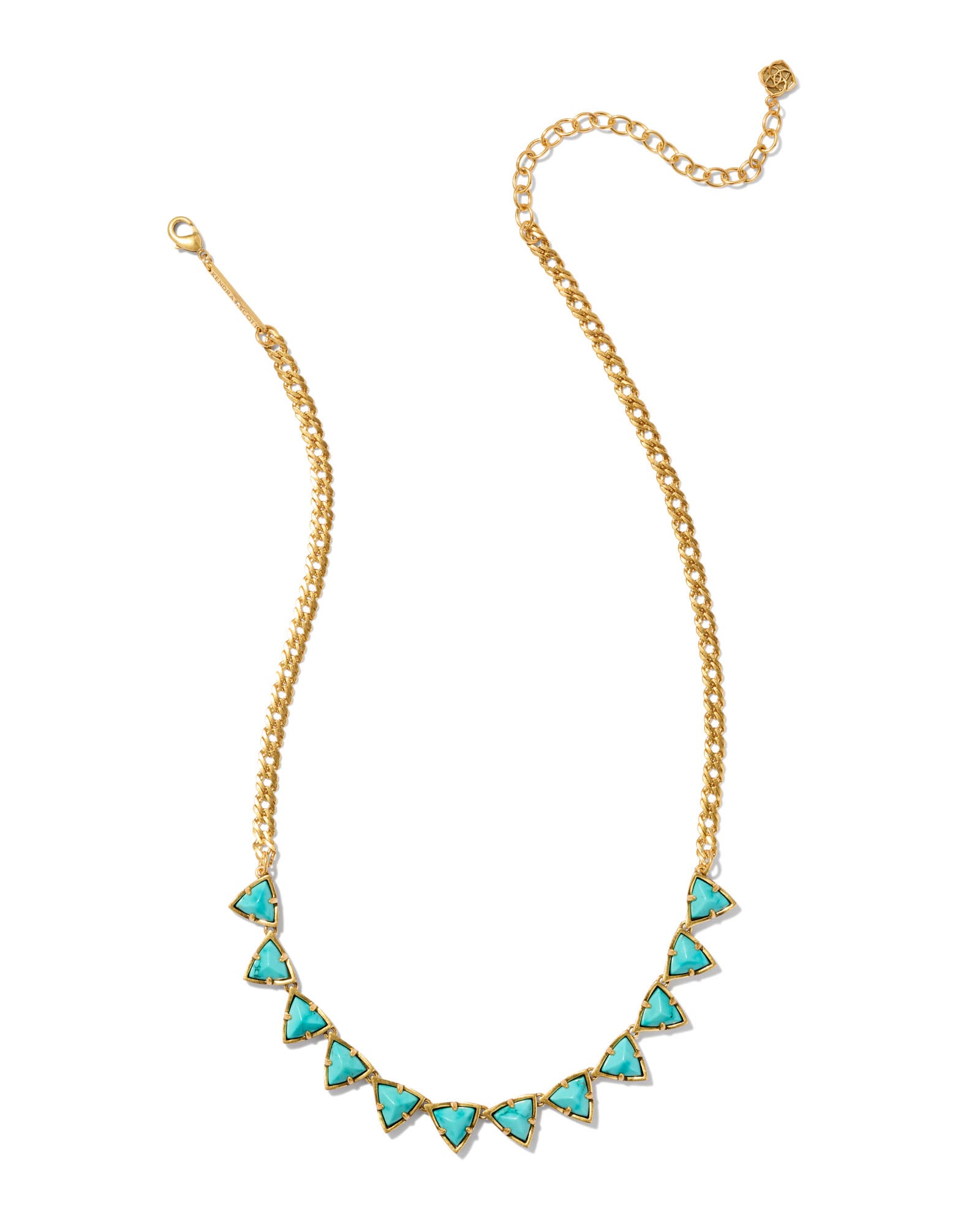 Artful design, vintage-inspired metal, and bold stones combine in the Robby Vintage Gold Strand Necklace in Variegated Turquoise Magnesite. A line of triangular-cut stones creates a one-of-a-kind, textured staple thatās perfect for styling solo or pairing with a pendant. This necklace is a part of Yellow Rose by Kendra Scottāa brand that celebrates ranch life with Kendra Scott staples alongside select curated jewelry pieces and accessories.