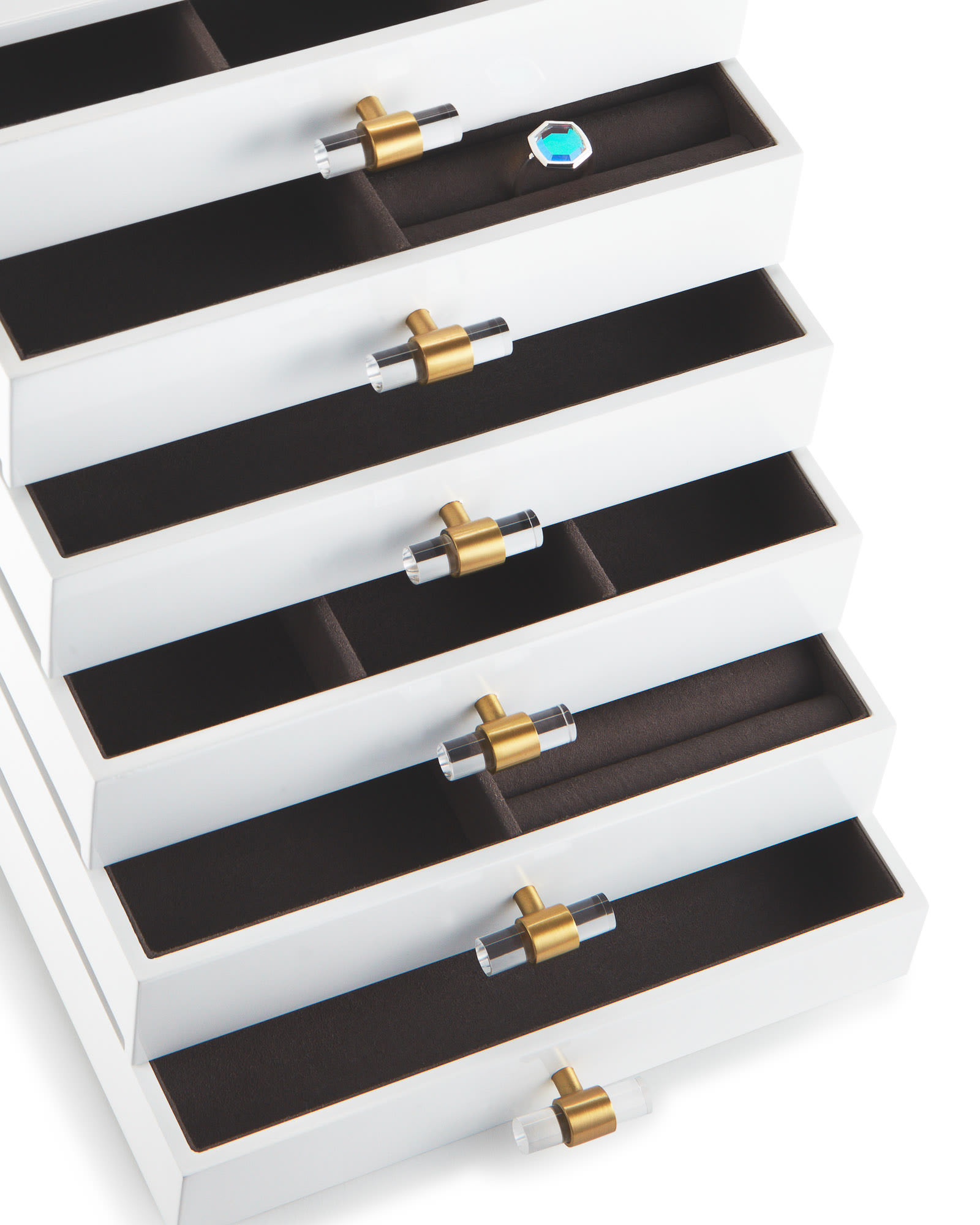 Keep the contents of your jewelry collection safe with the Tall Antique Brass Jewelry Box in White Lacquer, designed with six drawers to maximize on organization.