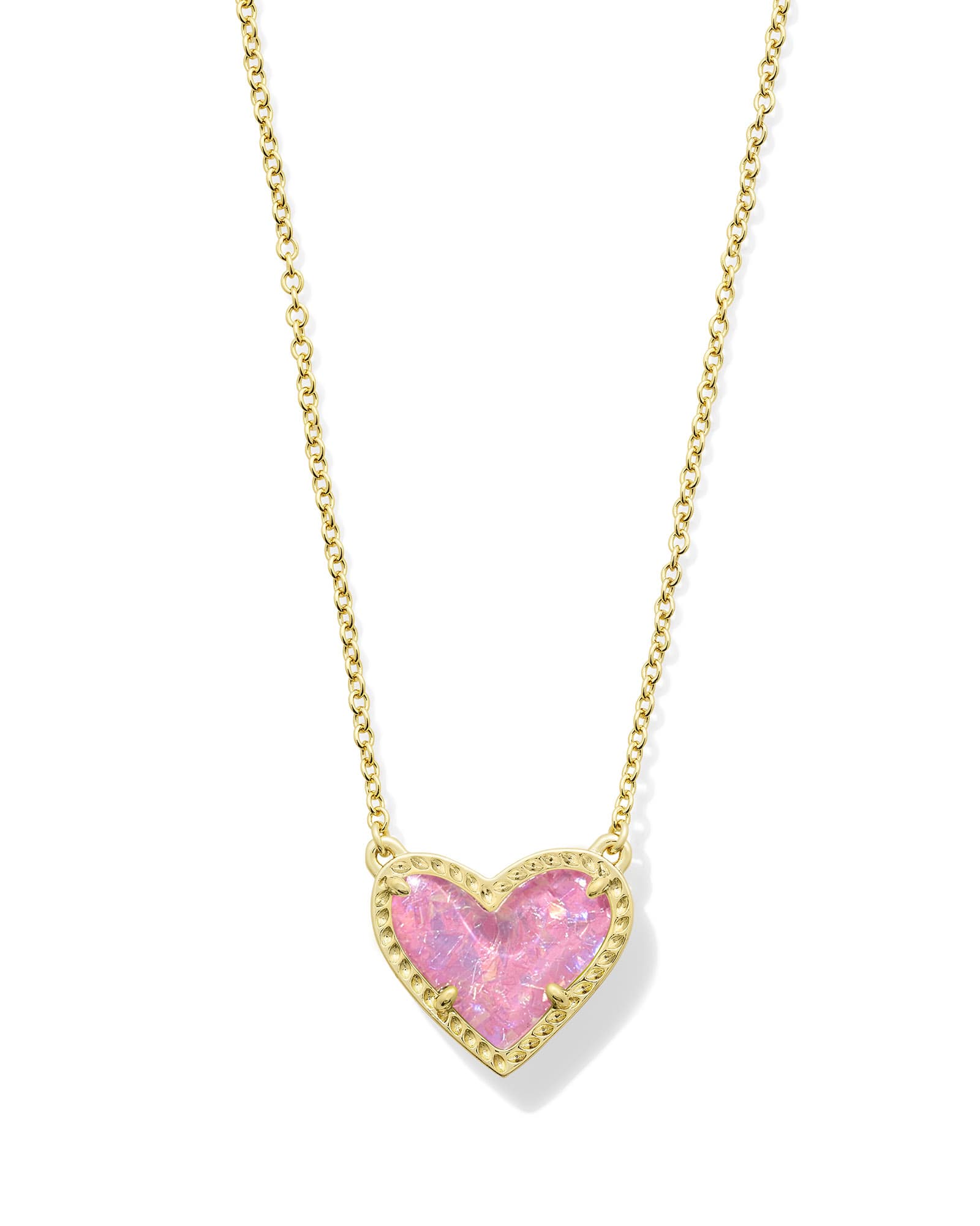 Ari Heart Gold Pendant Necklace in Pink Iridescent Glitter Glass